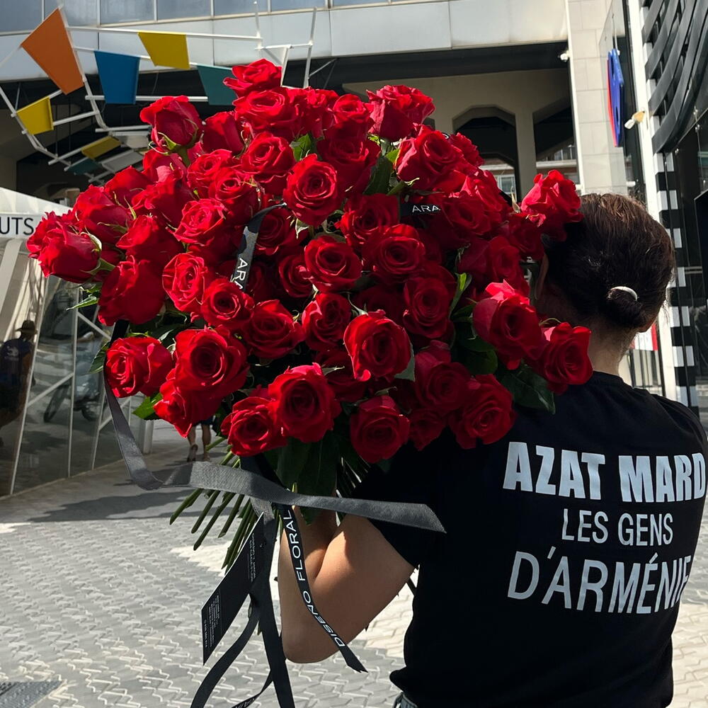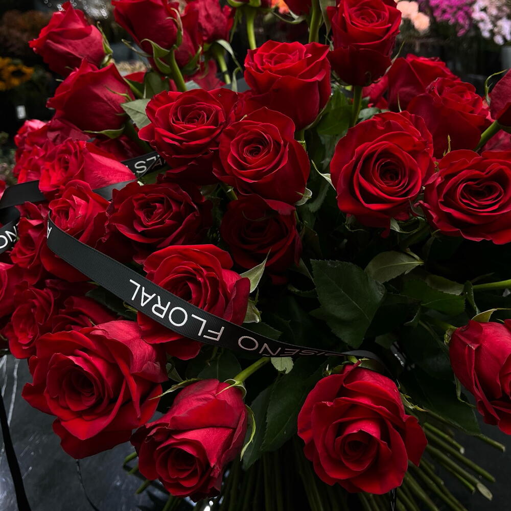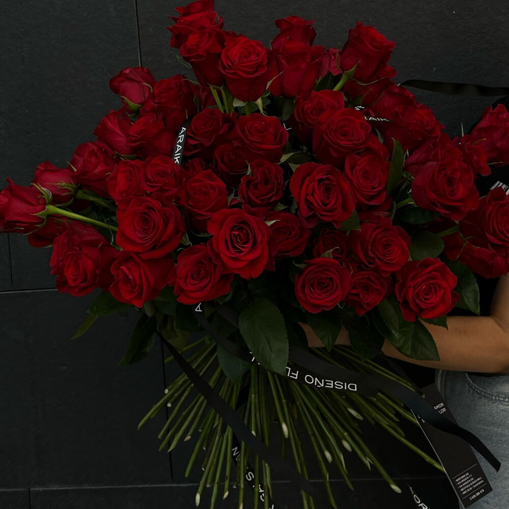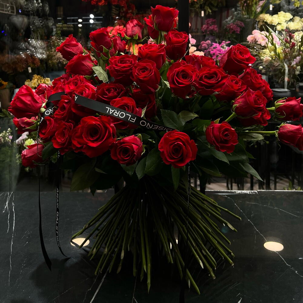 An imposing bouquet of 101 red roses, with long, perfectly aligned stems, conveying strength, passion and absolute elegance. The roses, in an intense, velvety red, form a generous and balanced volume, creating a rounded and very striking silhouette. The finish is clean and sophisticated, with the natural green of the foliage providing contrast and depth, and a black ribbon that reinforces its exclusive character. A classic and spectacular arrangement, designed to make an impact from the first moment and to express a deep, resounding message of love.