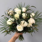 Un elegante ramo de rosas blancas frescas que transmite pureza, serenidad y sofisticación. Las delicadas flores se combinan con eucalipto aromático y hojas de palma decorativa, creando una composición natural con volumen y movimiento. El contraste entre los pétalos blancos y el follaje verde intenso aporta un estilo moderno y refinado, ideal para decorar cualquier espacio con elegancia. Este ramo es perfecto para bodas, aniversarios, celebraciones especiales, regalos románticos o para expresar respeto y gratitud. Su diseño equilibrado y su estética luminosa lo convierten en un detalle floral clásico y atemporal. Para mantener el ramo fresco durante más tiempo, se recomienda cortar los tallos en diagonal antes de colocarlos en un jarrón con agua limpia, cambiar el agua cada 1–2 días y mantener el ramo en un lugar fresco, lejos de la luz solar directa y de fuentes de calor. También es aconsejable retirar las hojas que queden sumergidas en el agua para evitar bacterias y prolongar la vida de las flores.