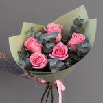 This product belongs to the Classic Bouquets category, featuring a delicate mix of 4 sprigs of fresh eucalyptus that add a touch of freshness and a distinctive aroma. It is complemented by 5 beautiful roses in a charming pink, which aim to add a warm and pleasant atmosphere to any space. This classic bouquet is perfect for decorating your home, office, or as a gift for any occasion.