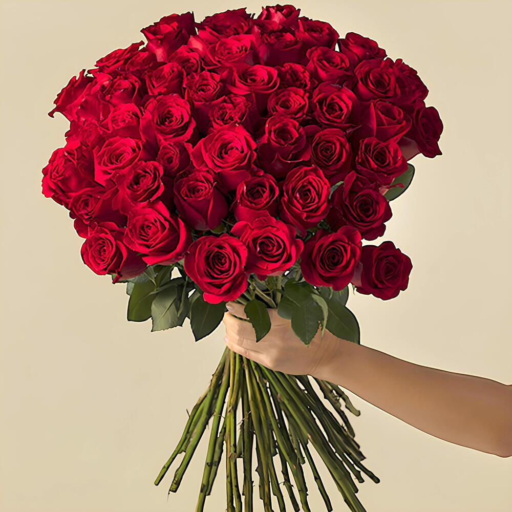 50 Freedom long-stem red roses. Freedom is a well-known variety noted for its intense red color and long vase life.