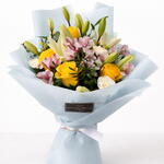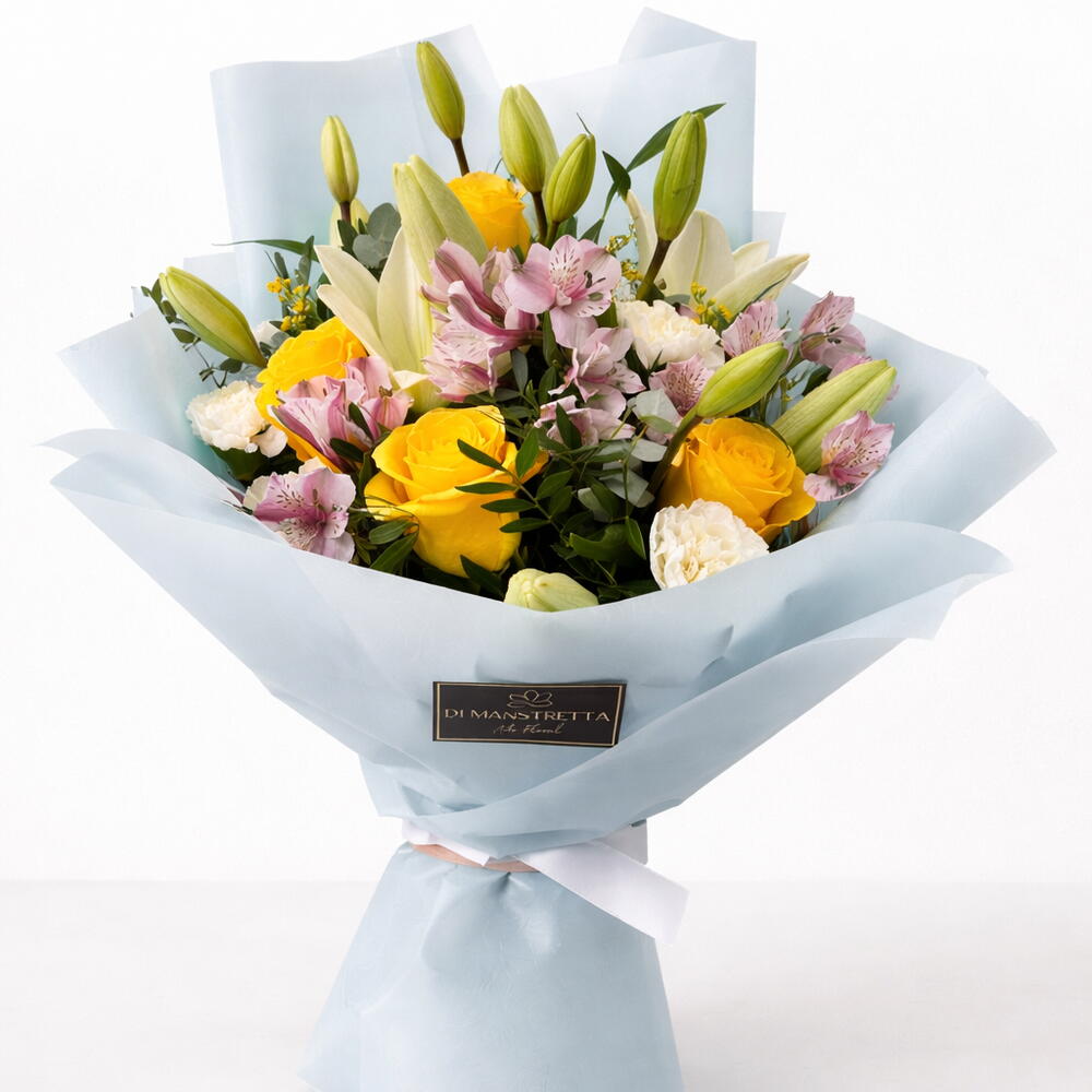 An elegant, luminous bouquet that captures the essence of spring in every detail. The combination of yellow roses, white lilies and pink alstroemerias, together with carnations and natural greenery, creates a harmonious, fresh and full-of-life composition. Its color palette conveys optimism, delicacy and joy, making it the perfect gift for any special occasion. The light-blue wrapping provides a sophisticated, modern finish, further highlighting the natural beauty of the flowers.