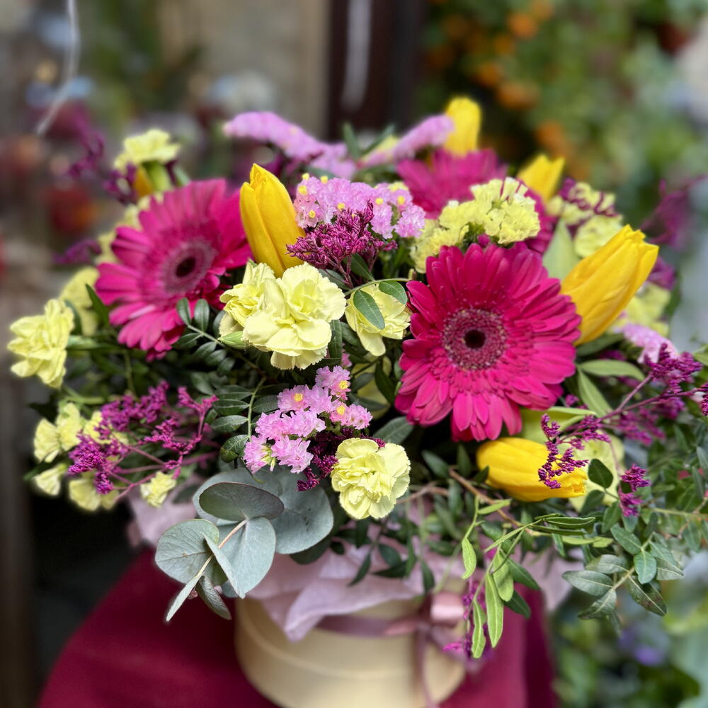 Fuchsia gerbera - 3 pcs tulipanes amarillos - 5 pcs eucalyptus stems - 3 pcs lemon-colored carnations - 7 pcs statice sprigs (pink and fuchsia) - 4 pcs pistachio stems - 3 pcs salal stems - 3 pcs