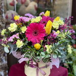 «Joy in Bloom» is a composition full of vibrant colors and vitality. The contrast between intense fuchsia and sunny yellow creates a truly festive and joyful arrangement. Thanks to the floral foam, the flowers stay fresh longer, making this basket the perfect gift for any occasion.