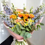 A bouquet that captures the energy and color of a bright sunrise. This bouquet combines the warmth of sunflowers and orange roses with the delicacy of white and lilac flowers. Chamomile accents and eucalyptus leaves add freshness and a natural feel to this lively composition. Perfect for special occasions such as birthdays, thank-yous or simply to brighten a day, its plaid wrapping adds a charming, country touch. This bouquet is a reminder of the small moments full of light and joy.
