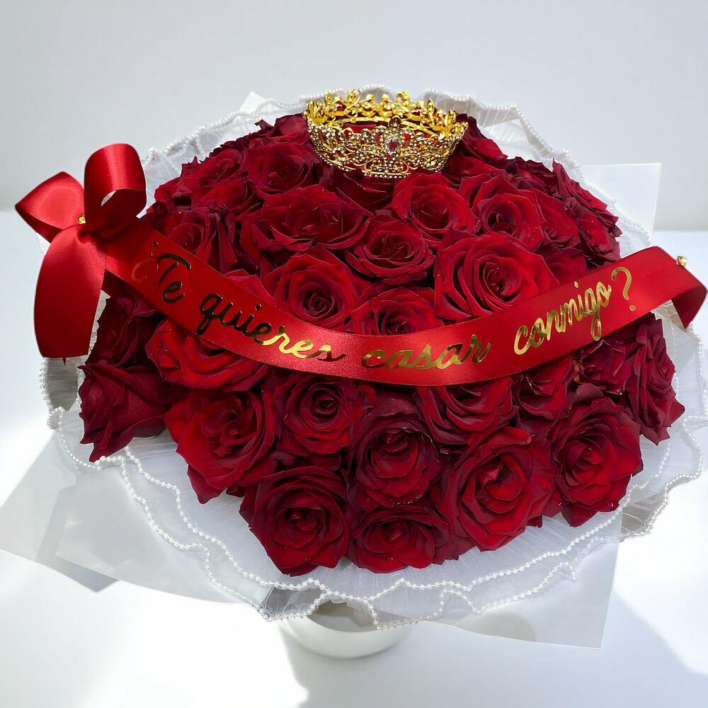 Ramo de 50 rosas rojas, decorado con papel de lujo y Corona de cristales, con cinta con mensajes a elegir te quieres casar conmigo, quieres ser mi novia o solo porque te quiero, te amo.