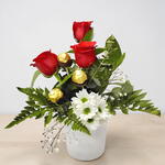 This classic bouquet is a true expression of love and passion. Composed of 3 red roses, a symbol of deep and devoted love, it is complemented by the delicacy of a single daisy, a symbol of innocence and purity. And for those with a sweeter taste, this bouquet also comes with 3 indulgent chocolates to delight the palate and the heart. Ideal for gifting on anniversaries, birthdays, or simply to make a kind gesture to someone special. Vase not included.