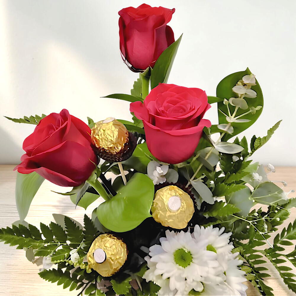 This classic bouquet is a true expression of love and passion. Composed of 3 red roses, a symbol of deep and devoted love, it is complemented by the delicacy of a single daisy, a symbol of innocence and purity. And for those with a sweeter taste, this bouquet also comes with 3 indulgent chocolates to delight the palate and the heart. Ideal for gifting on anniversaries, birthdays, or simply to make a kind gesture to someone special. Vase not included.