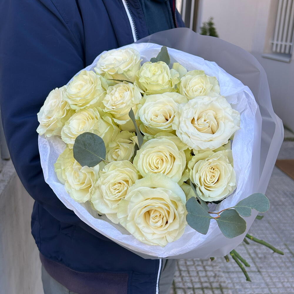 A delicate bouquet of 15 white roses and eucalyptus will speak of your feelings