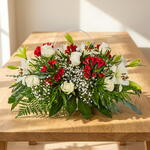 This delicate funeral arrangement combines elegance and serenity in a balanced composition full of meaning. White roses symbolize purity and respect, while the red accents express deep and eternal love. Lilies bring nobility and solemnity, elevating the composition with their majestic presence. Gypsophila adds lightness and softness, creating an ethereal and harmonious effect. Green foliage envelops each flower, highlighting their natural beauty and adding freshness. Its horizontal design makes it ideal for intimate ceremonies and respectful farewells. It is a floral tribute that conveys peace, affection and eternal remembrance.