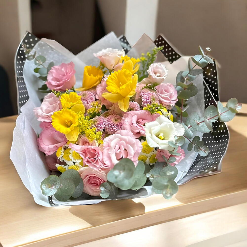 A bouquet that radiates light and freshness, perfect for celebrating the arrival of spring. Vibrant yellow daffodils combine with white lisianthus and roses in pastel shades, creating a cheerful and delicate composition. Pink chrysanthemums and chamomile details add a soft, charming touch, while eucalyptus sprigs bring freshness and natural elegance. Wrapped in a modern design with black-and-white accents, this bouquet is ideal for gifting on any special occasion or simply to brighten someone's day.