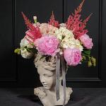 This stunning centerpiece combines classical art and nature in a single piece. A sculptural bust serves as the base for a lush bouquet of pink peonies, ivory hydrangeas, soft red astilbe and delicate green accents. Ideal for weddings, special events or as sophisticated home décor, its design balances romance and modernity, becoming a unique focal point. Care recommendations: Place the arrangement in a cool spot, avoiding direct sunlight and drafts. Keep the container's water clean, refilling it with fresh water every two days so the flowers retain their beauty for as long as possible. Remove any flower that begins to wilt to prolong the freshness of the arrangement and enjoy its elegance for more days.