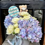 hortensias - 2 pcs oso de peluche - 1 pcs mini roses - 15 pcs stick baby boy - 1 pcs gift box with floral foam - 1 pcs
