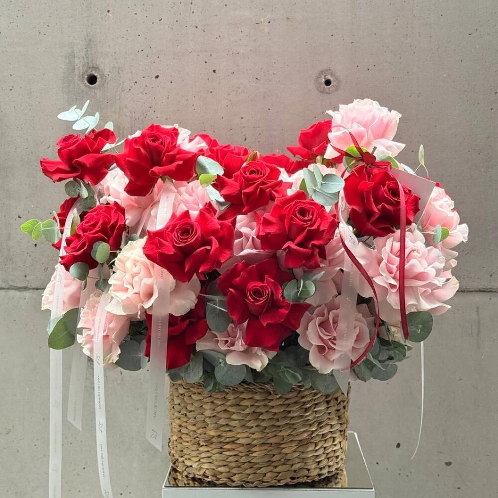 The composition includes French roses in two shades and eucalyptus branches, which add freshness and volume. Available in XL and XXL sizes. The packaging is in the form of a woven decorative basket, allowing the composition to look neat and ready for presentation without additional decoration.