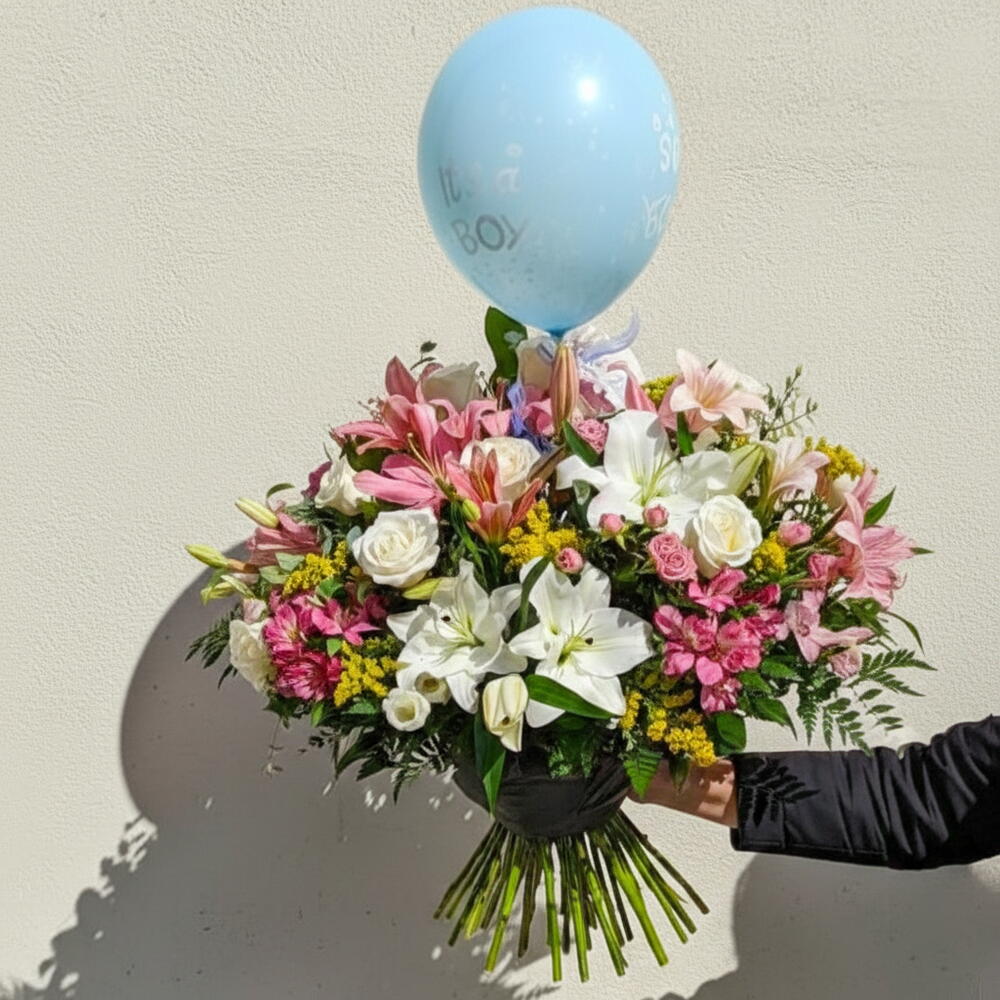 This charming bouquet “Welcome, Little Prince” is the perfect way to celebrate the arrival of a new baby. With a harmonious mix of lilies, roses and alstroemerias, it evokes sweetness, purity and joy. The soft tones of white and pink are complemented by the vibrant yellow of solidago, adding a touch of sunshine and happiness. The blue balloon “It’s a Boy” gives it an extra-special touch for the occasion. Ideal for gifting in hospitals or for home delivery, conveying love and good wishes. Each flower was chosen with care to honor such a unique and unforgettable moment.