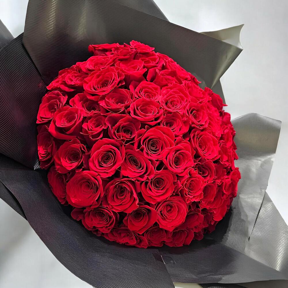 A striking and sophisticated bouquet that stands out for its intensity and elegance. The abundance of red roses creates a voluminous and luxurious arrangement, while the dark wrapping provides a modern and refined contrast. Perfect for expressing deep feelings and giving an unforgettable gift.