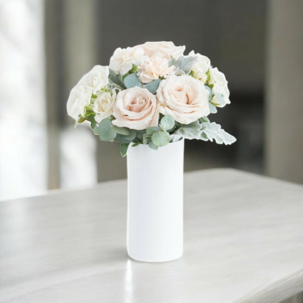 This charming bouquet combines the sophistication of Quicksand roses with the delicacy of the Lizzy carnation and romantic spray roses. The decorative greenery complements the design, creating a balanced and elegant floral arrangement. Perfect for special occasions or to add a touch of serenity and style to any space. To keep this bouquet fresh, trim the stems diagonally before placing them in a vase with clean water. Change the water every two days and add floral preservative, if available. Place the bouquet in a cool spot, away from direct sunlight and drafts, to prolong its beauty and freshness.