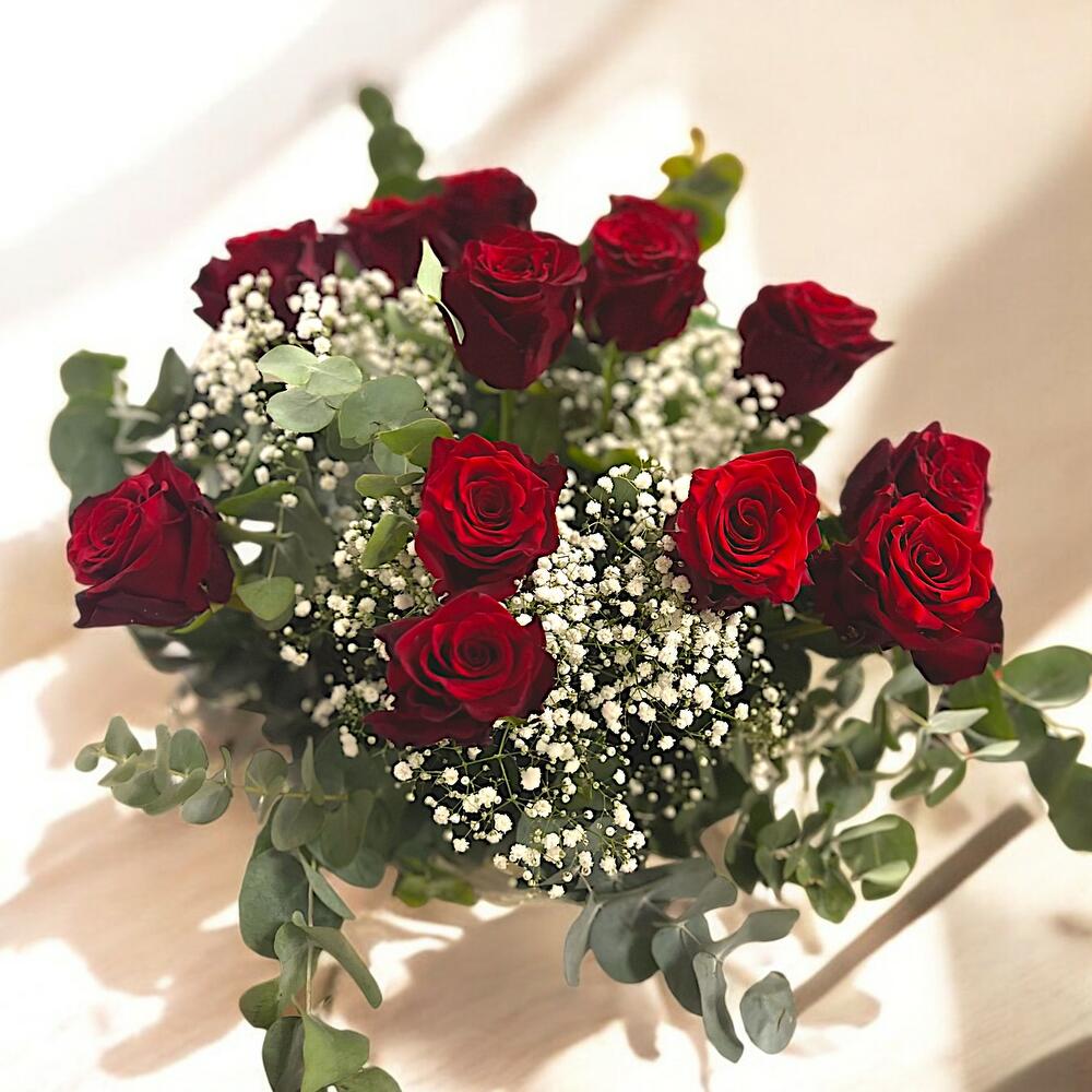 Bouquet of Red Roses with Eucalyptus and Gypsophila