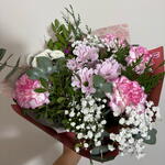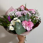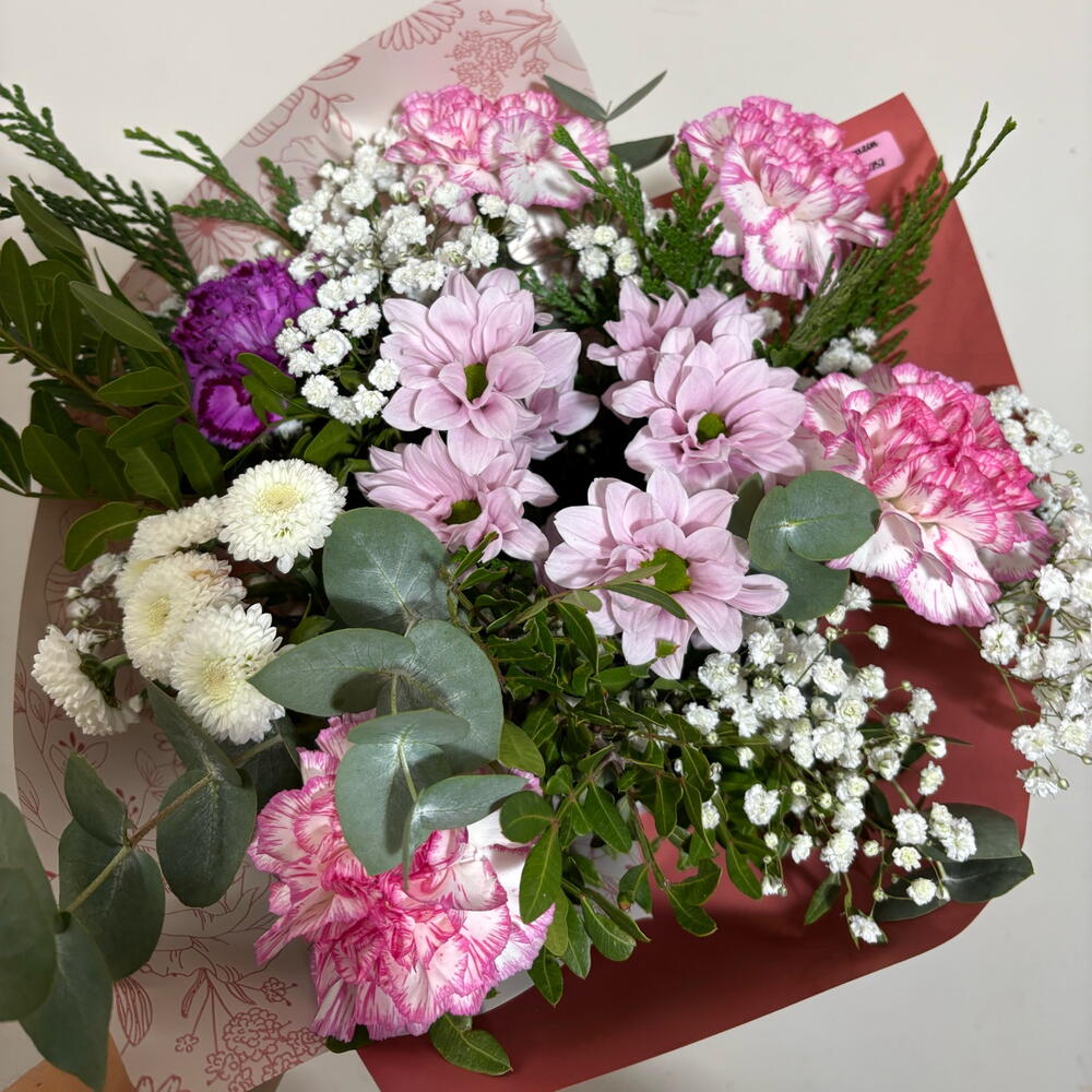 paniculata blanca - 1 pcs pink daisy - 1 pcs verde decorativo (follaje) - 1 pcs purple or bicolor carnation - 1 pcs pink or bicolor carnation - 4 pcs white daisy bud - 1 pcs