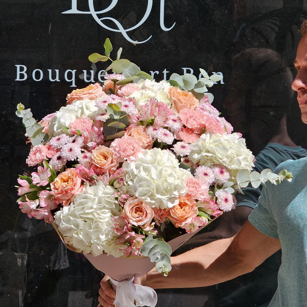 Eucalyptus - 5 pcs hydrangea - 5 pcs alstroemeria - 10 pcs rosa jardín - 9 pcs clavel mix - 15 pcs chrysanthemum button - 5 pcs