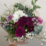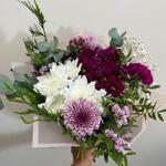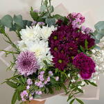 statice rosa - 1 pcs white daisy - 1 pcs paniculata blanca - 1 pcs fuchsia daisy - 1 pcs verde decorativo (follaje) - 1 pcs purple or bicolor carnation - 1 pcs chrysanthemum 1 bicolor flower - 1 pcs