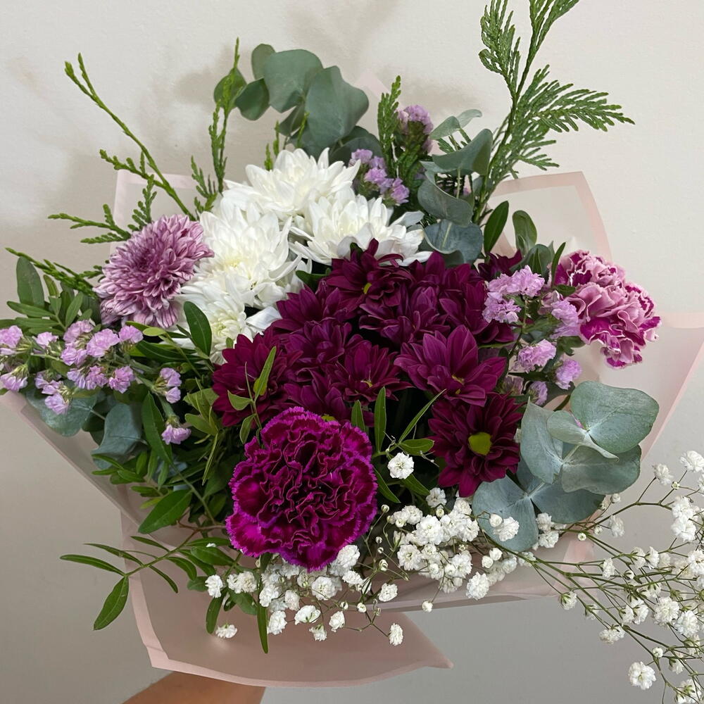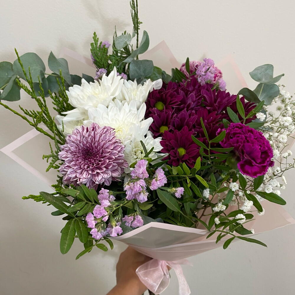 statice rosa - 1 pcs white daisy - 1 pcs paniculata blanca - 1 pcs fuchsia daisy - 1 pcs verde decorativo (follaje) - 1 pcs purple or bicolor carnation - 1 pcs chrysanthemum 1 bicolor flower - 1 pcs
