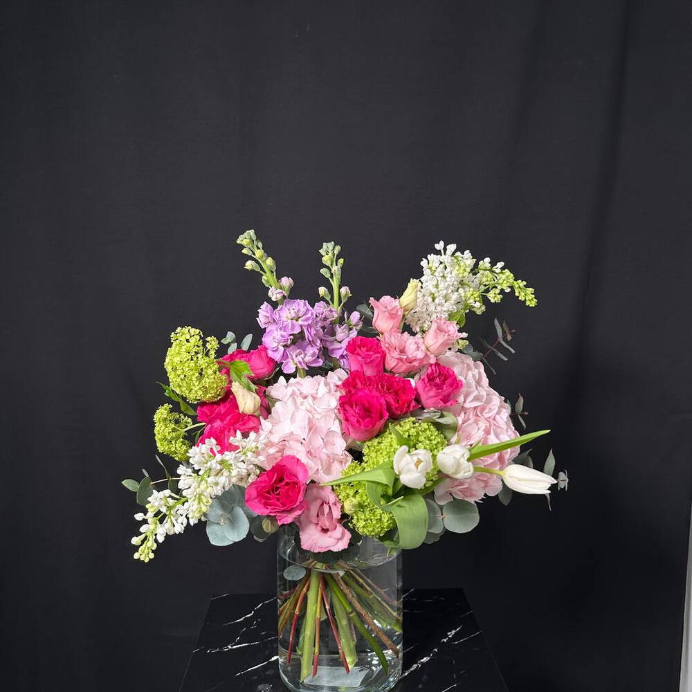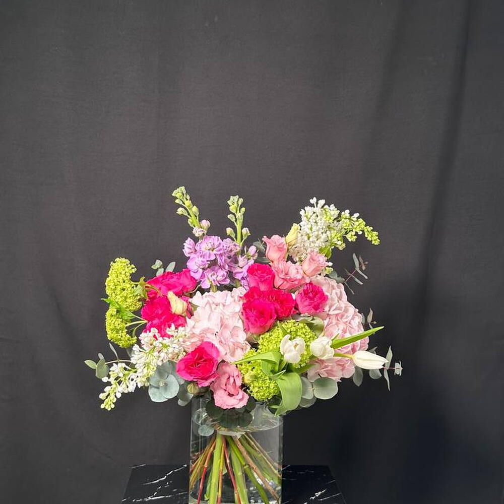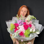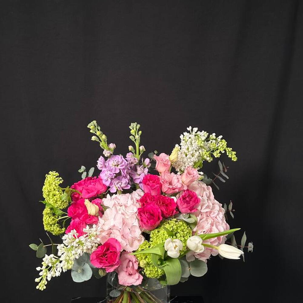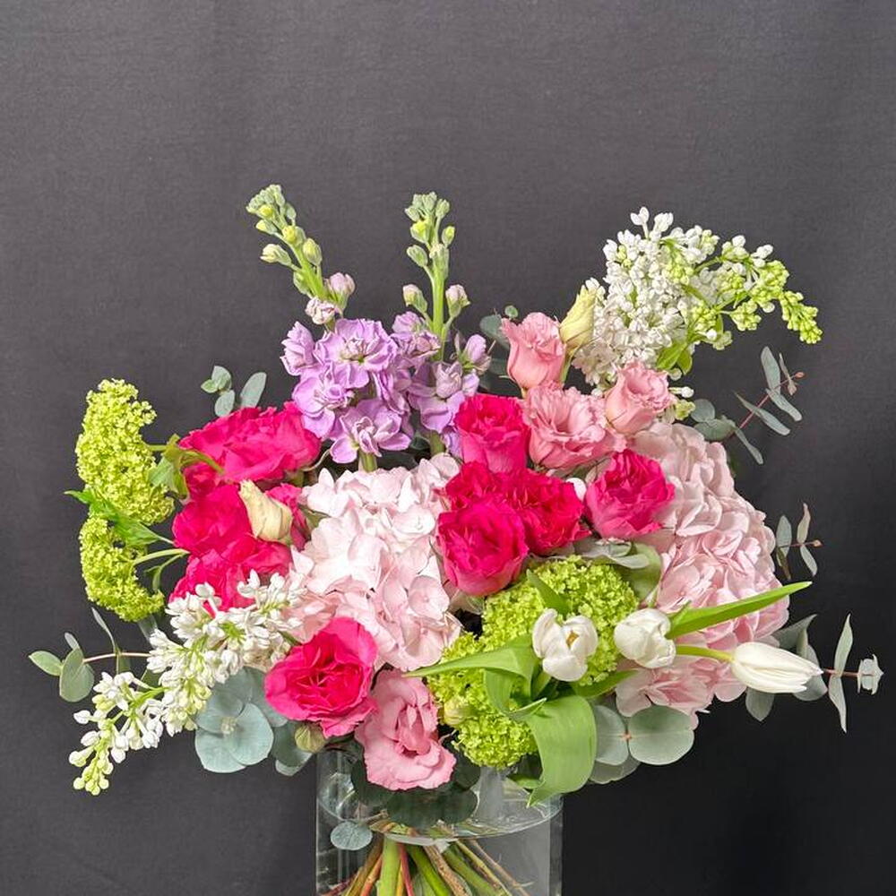 Viburnum - 2 pcs Lisianthus - 1 pcs tulips - 3 pcs mattiola - 2 pcs rosa arbustiva - 3 pcs pink hydrangea - 2 pcs lilac white - 4 pcs