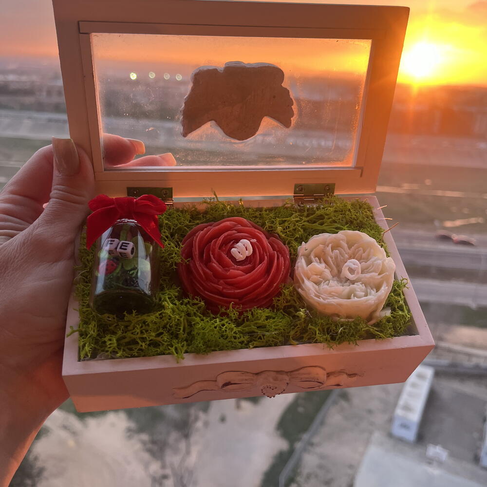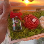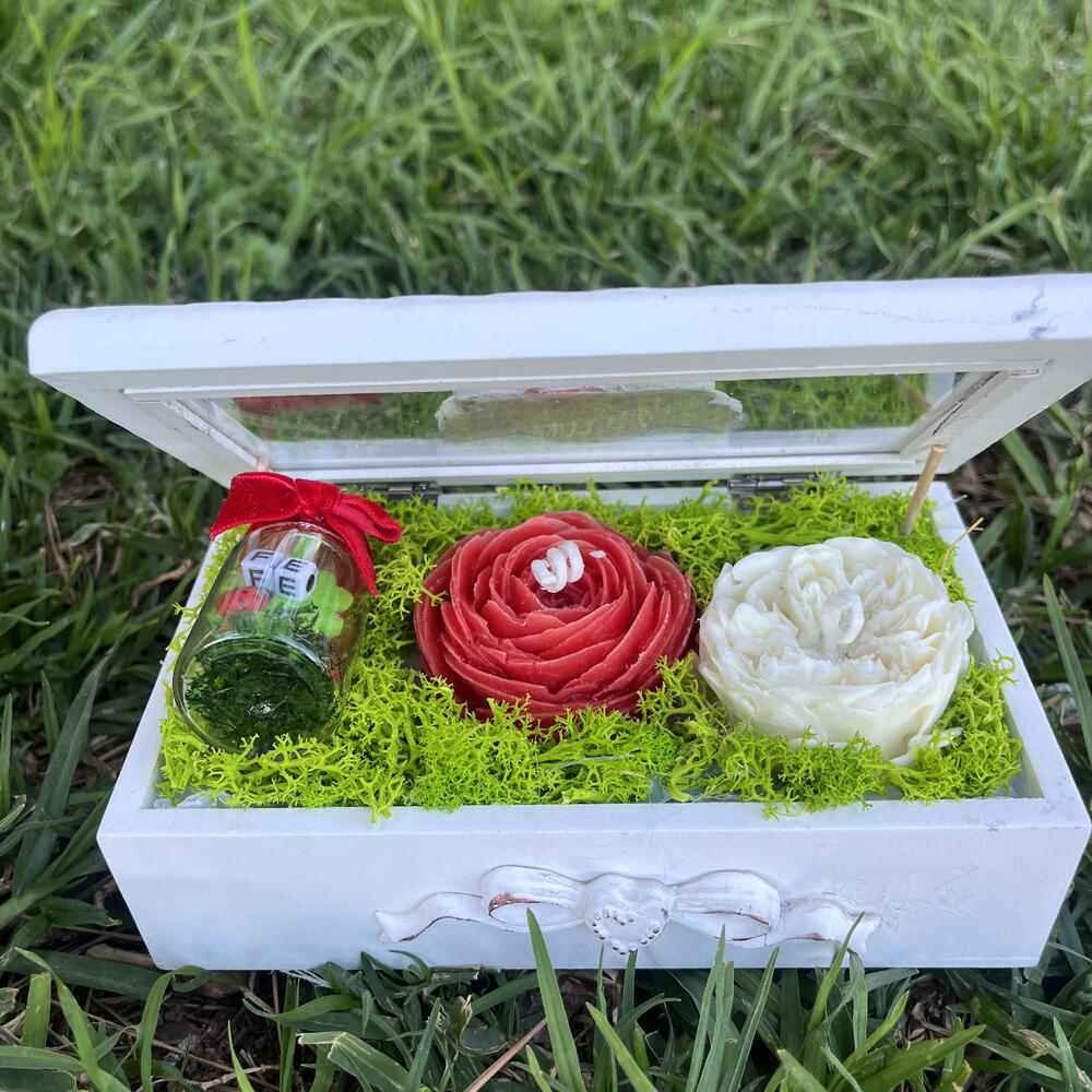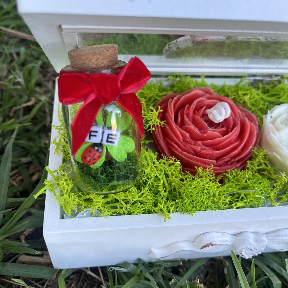 frasco con mariquita dentro palabra fe - 1 pcs flores aromatizadas velas soja - 2 pcs bello baul blanco madera con angel - 1 pcs