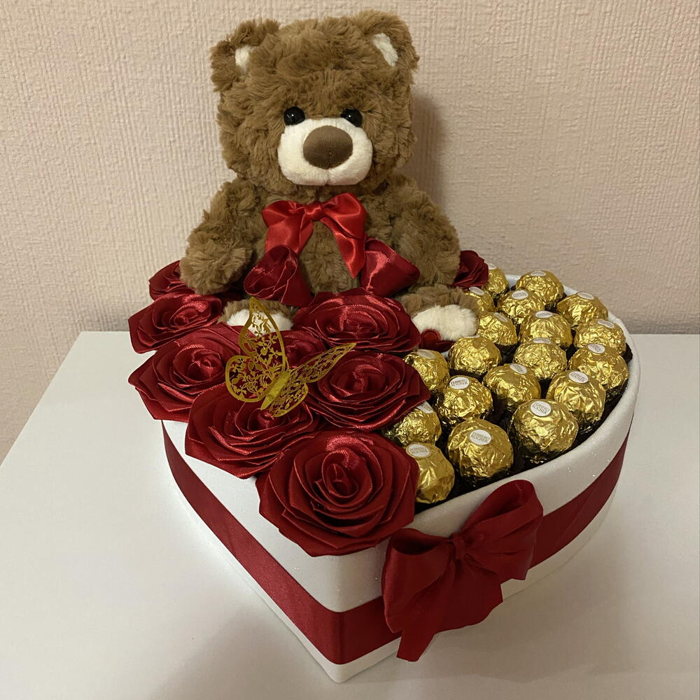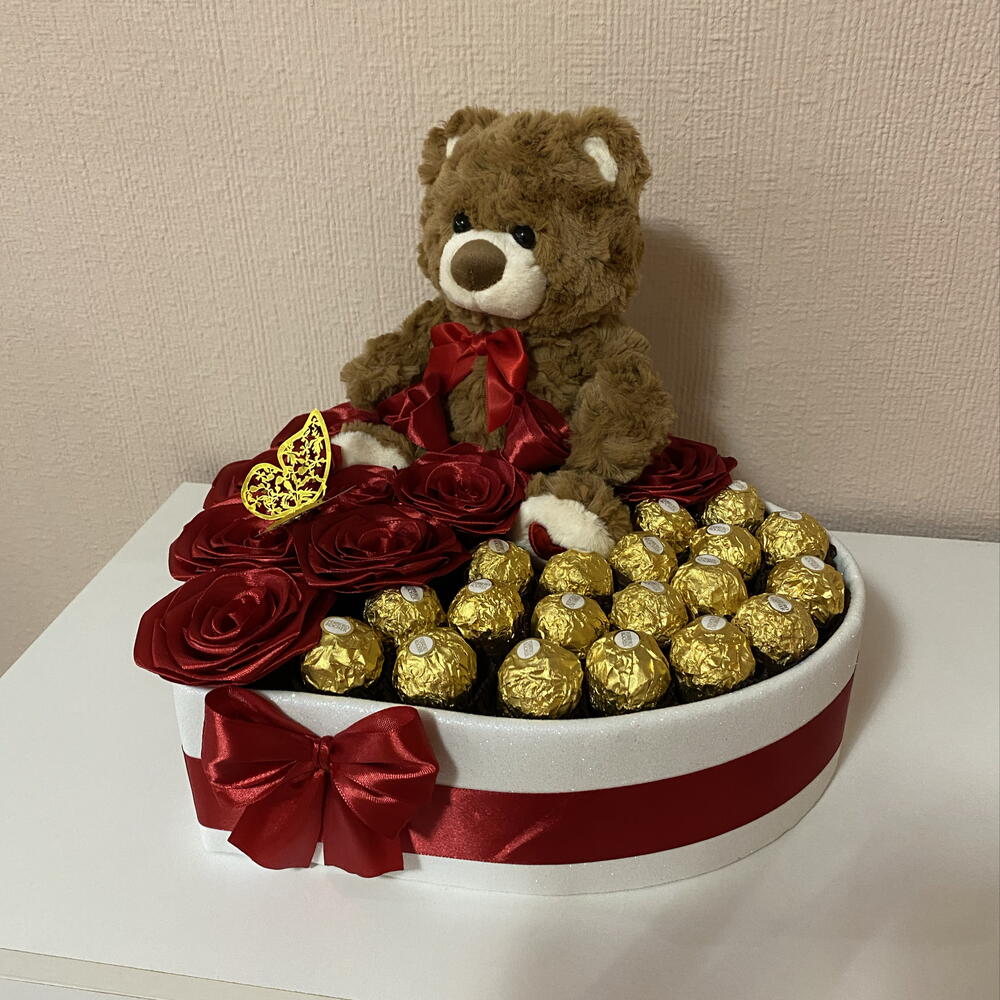 A special creation that turns any occasion into an unforgettable moment. This elegant heart-shaped box is the perfect gift if you want to surprise with something truly special. Ideal for: - anniversary - birthday - Mother's Day - graduation The 11 handmade satin roses, the 19 Ferrero Rocher chocolates and the soft brown plush teddy bear create a harmonious, elegant and emotion-filled combination. The perfect choice if you want to get your gift right without hassle. Box contents: - 11 premium handmade satin roses - 19 Ferrero Rocher chocolates - soft brown plush teddy bear Measurements: 33 cm wide 27 cm high Each piece is crafted with care, making this gift a special keepsake. Perfect for expressing: - love - gratitude - affection Includes 19 high-quality Ferrero Rocher chocolates. Ingredients: milk chocolate, hazelnuts, sugar, vegetable oil (palm), wheat flour, dairy ingredients, cocoa powder, soy lecithin, raising agent, salt and flavorings. Allergens: milk, hazelnuts, gluten and soy.