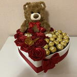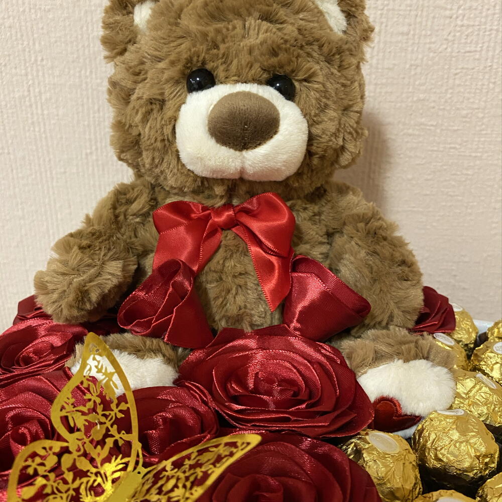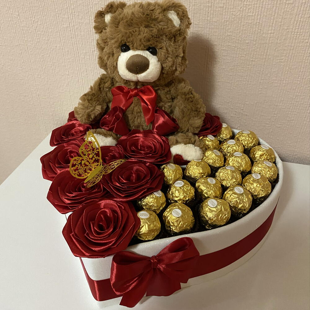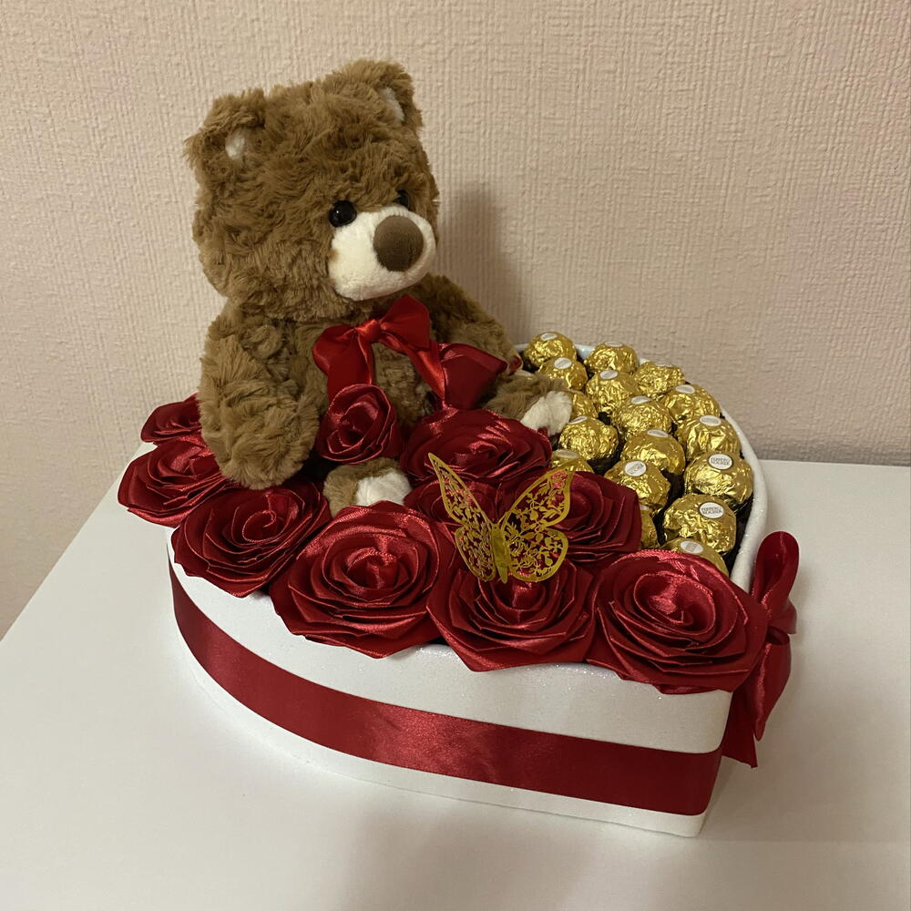 Ferrero rocher - 19 pcs decorative butterfly - 1 pcs rosas eternas - 11 pcs decorative heart-shaped box - 1 pcs soft brown plush teddy bear - 1 pcs