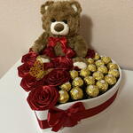 Heart-shaped box with brown teddy bear, roses and Ferrero - premium gift for anniversary, birthday, graduation and Mother's Day
