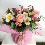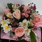 Alstroemeria - 4 pcs roses - 5 pcs eucalipto cinerea - 5 pcs caja decorativa - 1 pcs rosas spray - 4 pcs wax flower - 4 pcs esponja floral - 1 pcs