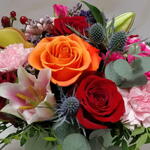 eryngium blue - 1 pcs clavel - 4 pcs rose spray - 2 pcs rosa roja - 5 pcs verdes variados - 3 pcs orange rose - 1 pcs pink lilies - 2 pcs hatbox - 1 pcs