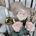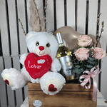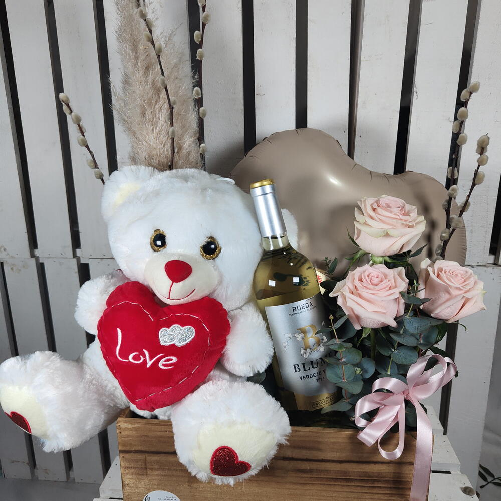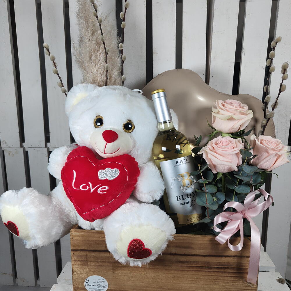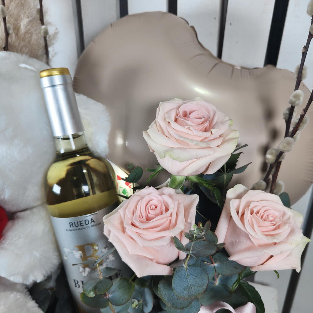 roses - 3 pcs eucalipto cinerea - 5 pcs willow - 3 pcs esponja floral - 2 pcs white wine - 1 pcs peluche osito - 1 pcs wooden box - 1 pcs feather duster - 1 pcs heart balloon - 1 pcs