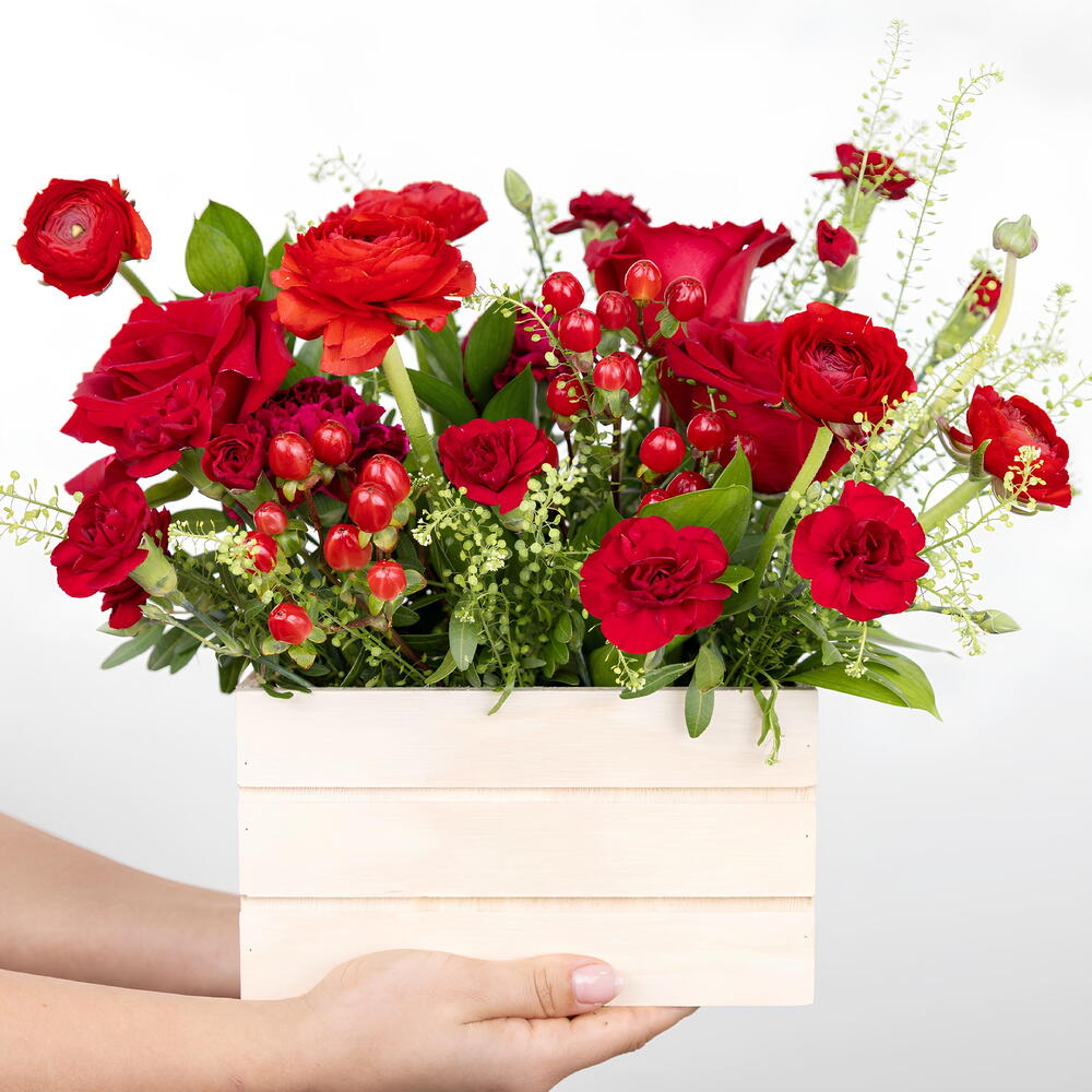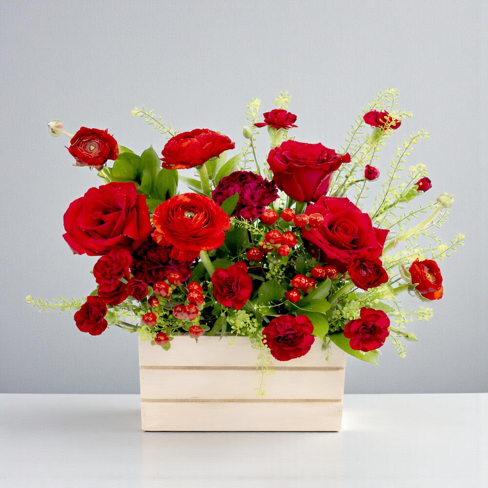 clavel - 3 pcs rosas rojas - 4 pcs hipérico - 3 pcs ranúnculos rojos - 4 pcs mini red roses - 3 pcs natural wood box - 1 pcs