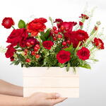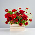 When words aren't enough, Red Passion Box arrives and says it all for you. A floral arrangement designed for Valentine's Day, where red—the universal symbol of love—takes center stage in a natural wood box that balances elegance and warmth. The combination of roses and seasonal flowers creates volume, texture, and an immediate visual impact. Ideal for surprising your partner, for a grand "I love you," or for that gesture that leaves a lasting impression. It works for anniversaries, Valentine's Day, or any day you want to elevate the romance. Because love isn't explained. It's given.