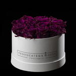 14cm round box of preserved purple roses