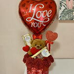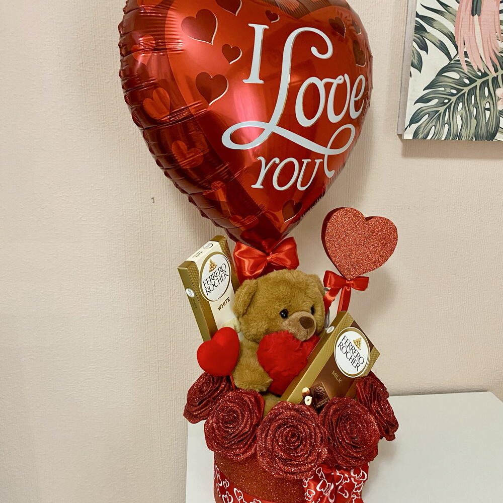 caja decorativa - 1 pcs rosas eternas - 9 pcs corazón decorativo - 1 pcs balloon i love you - 1 pcs ferrero rocher white chocolate 90g - 1 pcs ferrero rocher milk chocolate 90g - 1 pcs teddy bear with heart - 1 pcs handmade heart - 1 pcs