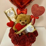 Perfect romantic gift ❤️ Handmade gift box, ideal for birthdays or to surprise someone special. Includes: – 9 handmade eternal roses in intense red with shimmer – Teddy bear with a heart – Balloon “I Love You” – Ferrero Rocher chocolates Milk and White - Heart An elegant, original item, ready to gift. 📏 Size: 34 cm wide, 64 cm high Each piece is individually handmade, so it's a truly special, one-of-a-kind gift.