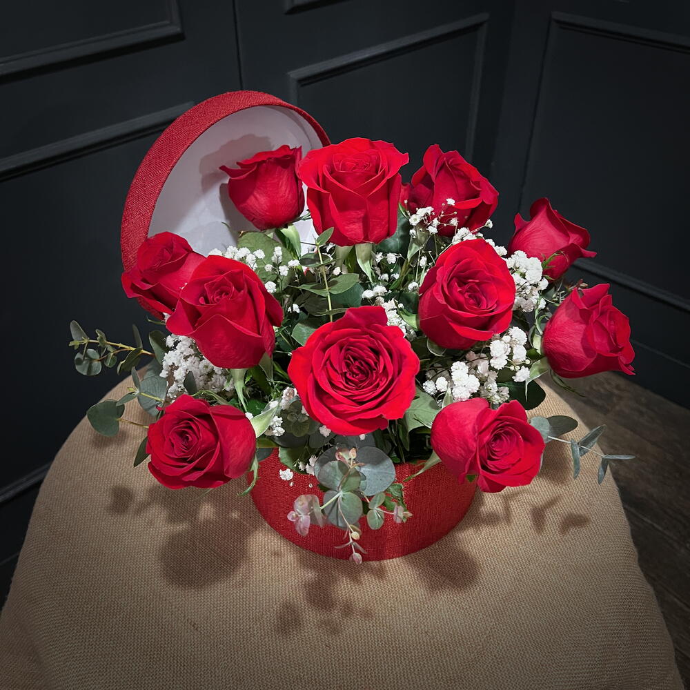 large hat box with twelve red roses