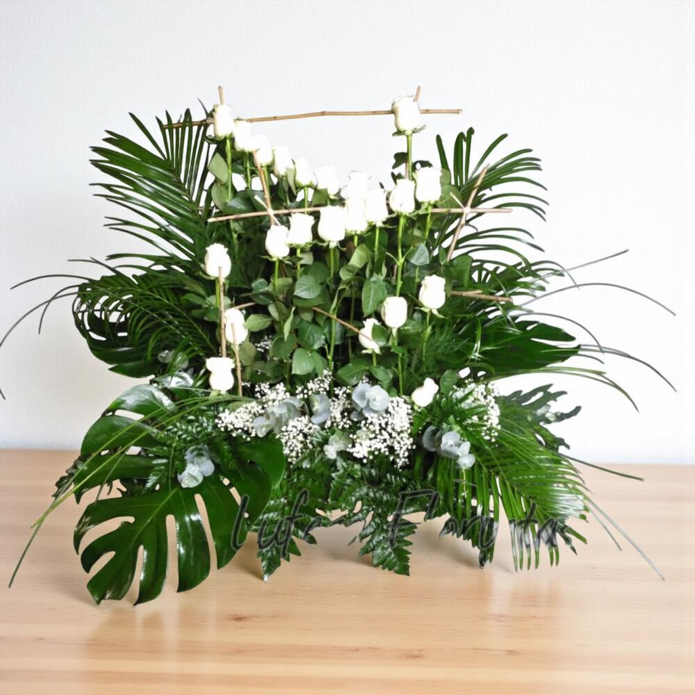 The White Rose Centerpiece stands out for its elegance and purity, ideal for conveying serenity, respect and eternal love. Its white roses, a symbol of peace and harmony, are combined with tropical greens and a natural structure that brings balance and sophistication. Perfect for ceremonies, elegant events, or as a condolence gesture full of beauty. Care recommendations: Place the centerpiece in a cool, well-ventilated place, avoiding direct exposure to sunlight or heat sources. Keep the floral foam always slightly moist, adding a little water every two days. Do not remove wilted flowers immediately; wait until they are completely dry to preserve the arrangement.