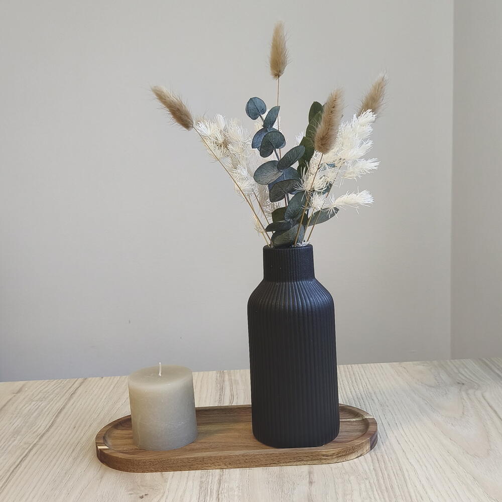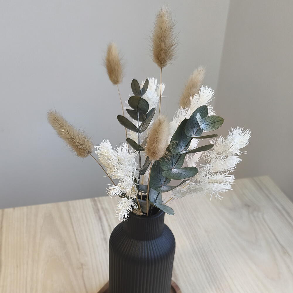 Centro decorativo de estilo natural y elegante, compuesto por jarrón negro con flores preservadas y vela a juego sobre bandeja de madera. Diseñado para aportar calma, equilibrio y estilo a cualquier espacio. Perfecto como regalo o decoración para el hogar. Incluye: - Jarrón negro con composición de flores preservadas y secas - Vela en tono neutro - Bandeja de madera - Tarjeta a juego incluida 🌿 Hecho a mano con flores preservadas de larga duración. 🎁 Listo para regalar. 📸 Recibirás foto del producto terminado antes del envío.