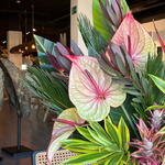 heliconia - 2 pcs pineapple - 2 pcs anthurium - 4 pcs ceramic base - 1 pcs ld jester - 3 pcs cicas leaves - 5 pcs anigoz bush sunset - 2 pcs dracaena leaves - 3 pcs