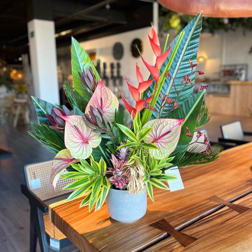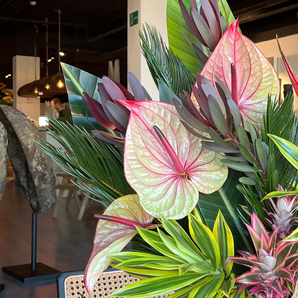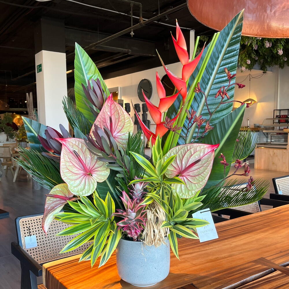Center with tropical flowers, sometimes the floral centers can arrive at their destination with flowers of a different color or variety than the one in the photo, depending on availability. Welcome to the floral paradise of Malaga, discover our tropical and exotic flowers, choose bright colors and lush leaves to give life to any corner or differentiate yourself with a unique floral gift.