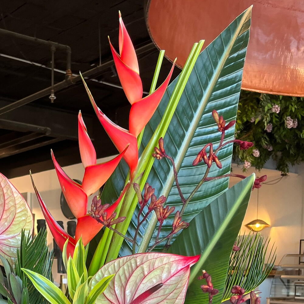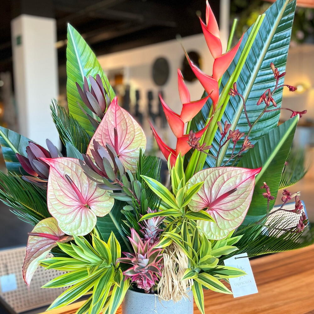 heliconia - 2 pcs pineapple - 2 pcs anthurium - 4 pcs ceramic base - 1 pcs ld jester - 3 pcs cicas leaves - 5 pcs anigoz bush sunset - 2 pcs dracaena leaves - 3 pcs