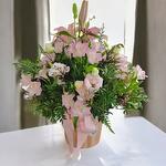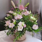 Centerpiece of assorted flowers in pink tones composed of lisianthus, alstroemerias, lilies, waxflower, and assorted greenery, set on a wooden base. A lovely centerpiece to brighten our nearest and dearest!