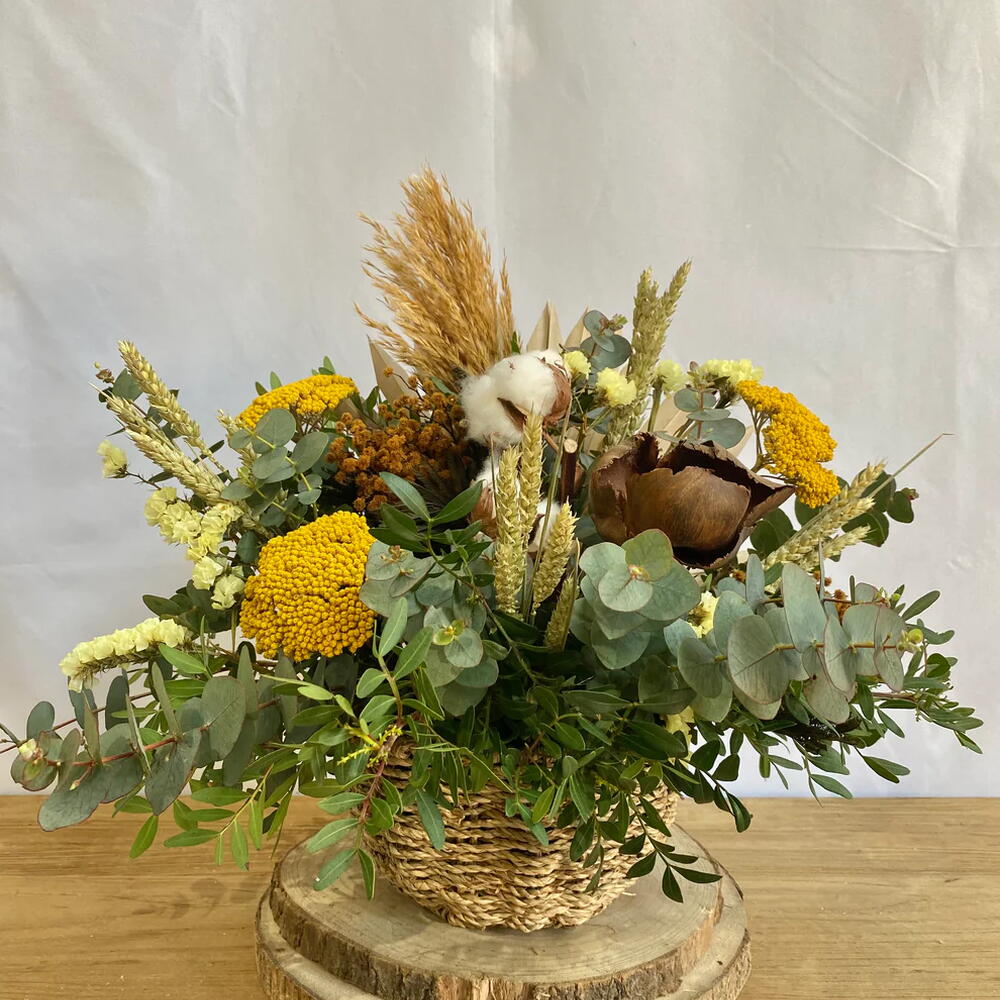 Round basket made of natural rope, 20 cm in diameter, composed of lentisk, Eucalyptus cinerea, achillea, yellow statice, preserved mimosa, natural dried wheat, pampas grass, cotton flower and wooden flower. The measurements with the flowers are 50 cm wide and 40 cm high