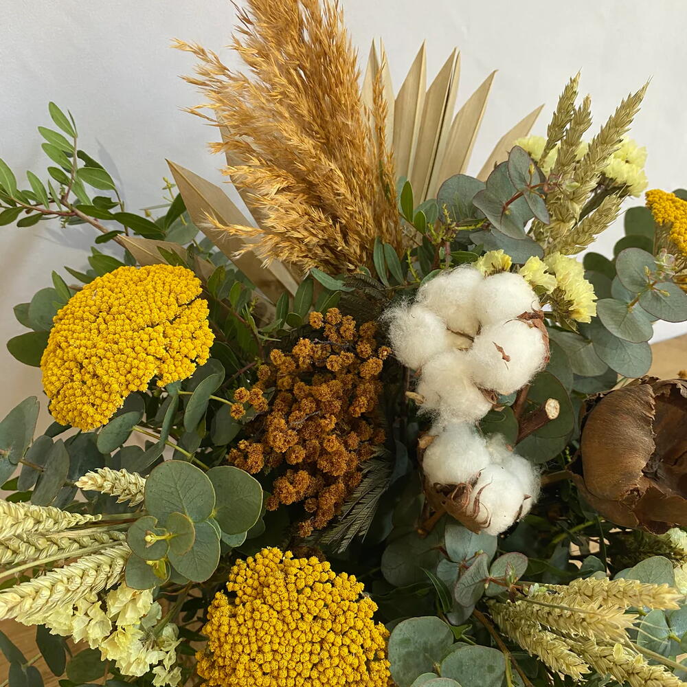 eucalyptus - 14 pcs pampa - 1 pcs yellow statice - 5 pcs lentisco - 6 pcs wheat - 10 pcs yarrow - 3 pcs preserved mimosa - 2 pcs cotton flower - 1 pcs wooden flower - 1 pcs