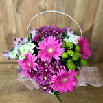 Gerbera - 6 pcs alstroemerias - 3 pcs cesta de mimbre - 1 pcs pink limonium - 4 pcs sponge - 1 pcs fuchsia daisies - 4 pcs botones verdes - 4 pcs ribbons - 3 pcs