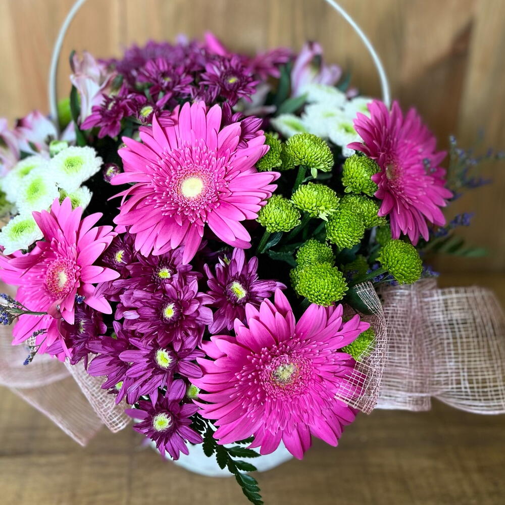 Gerbera - 6 pcs alstroemerias - 3 pcs cesta de mimbre - 1 pcs pink limonium - 4 pcs sponge - 1 pcs fuchsia daisies - 4 pcs botones verdes - 4 pcs ribbons - 3 pcs