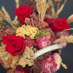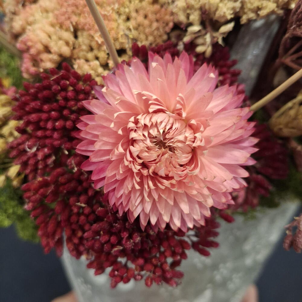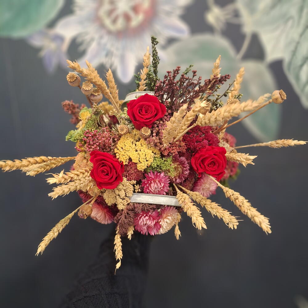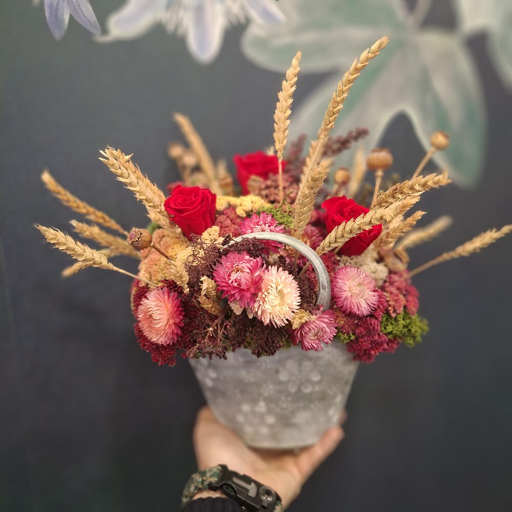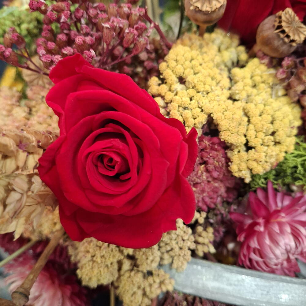 everlastings - 6 pcs espigas preservadas - 25 pcs lazo de cinta - 1 pcs eternal red rose (freeze-dried) - 3 pcs preserved green moss - 6 pcs preserved yarrow - 8 pcs medium embossed metal basket - 1 pcs